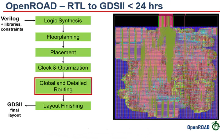 The OpenROAD project is a non-profit project, originally funded by DARPA with the aim of creating open-source EDA tools; an Autonomous flow from RTL-GDSII that completes < 24 hrs, to lower cost and boost innovation in IC design. This project is now supported by Precision Innovations.