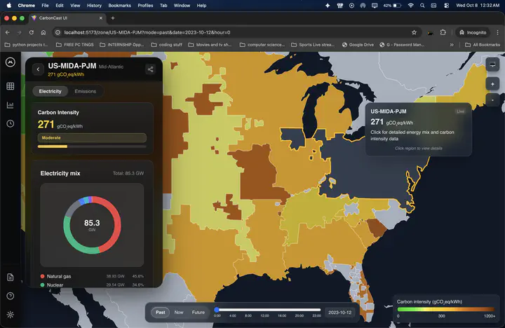 Hi everyone—this is my final report for CarbonCast, mentored by Professor Abel Souza. Back in June, my goal was simple to say and harder to pull off: help people see when the grid is cleaner and make it easy to act on that information. Over the summer I turned CarbonCast from a research prototype into something you can open, click, and rely on: a containerized backend, a clean API, and a fast, friendly map UI.